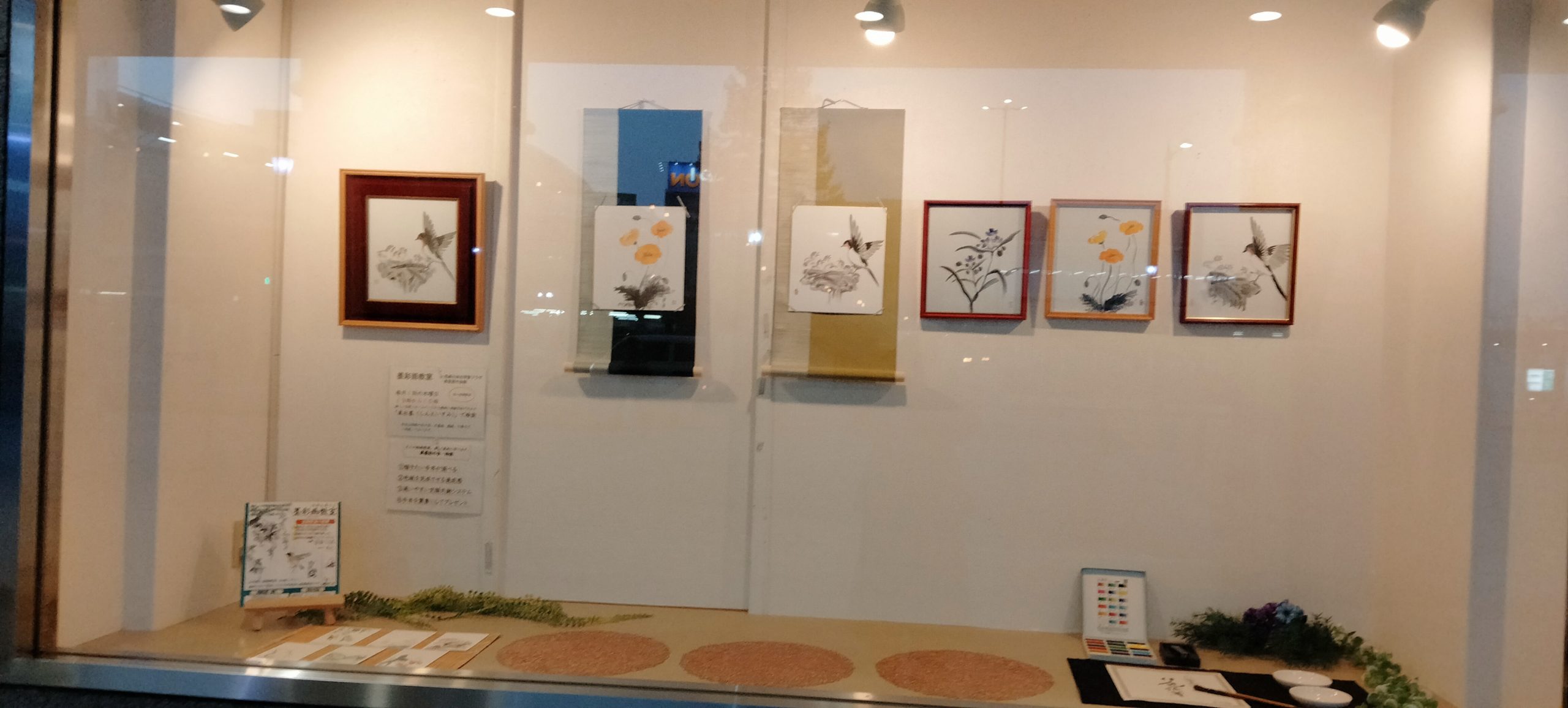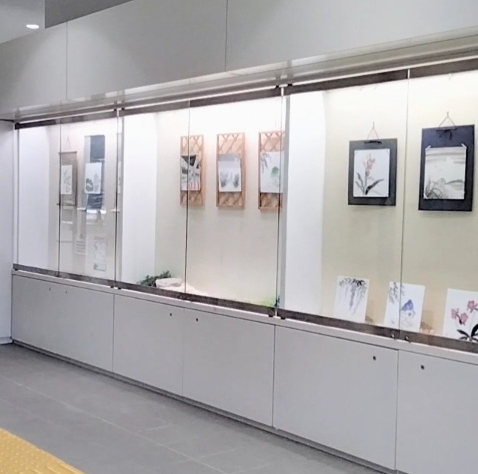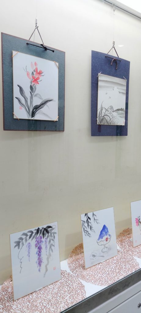 福島区民センター1階のショーケースにて生徒様の色紙作品を展示。